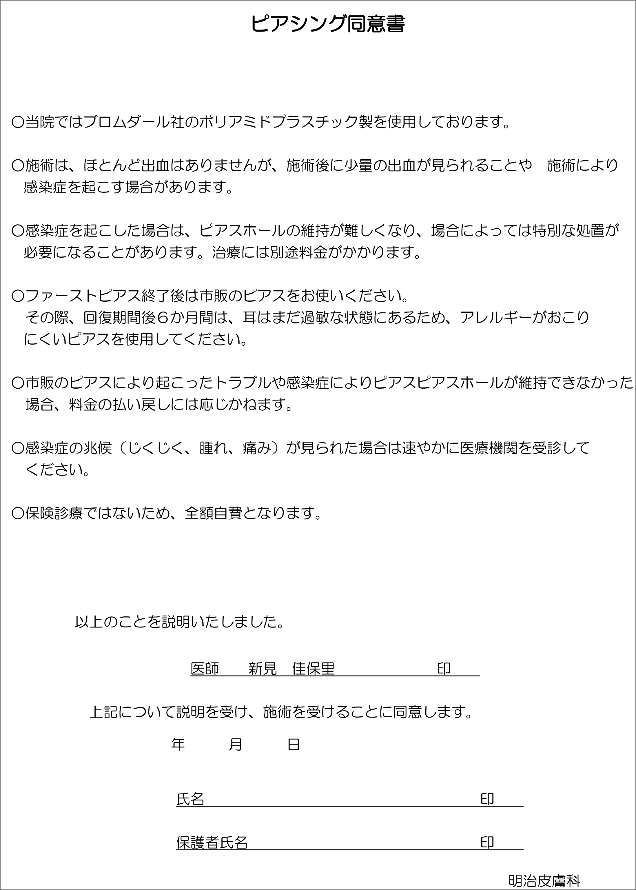 当院では未成年者の方がピアシングを受ける場合、保護者の方の承諾が必要になります。 ホームページからピアシング同意書をダウンロード、印刷をしていただき用紙に保護者の方のサインを記入し持参していただきます。(ご本人様だけの来院でピアシングが受けられます。)